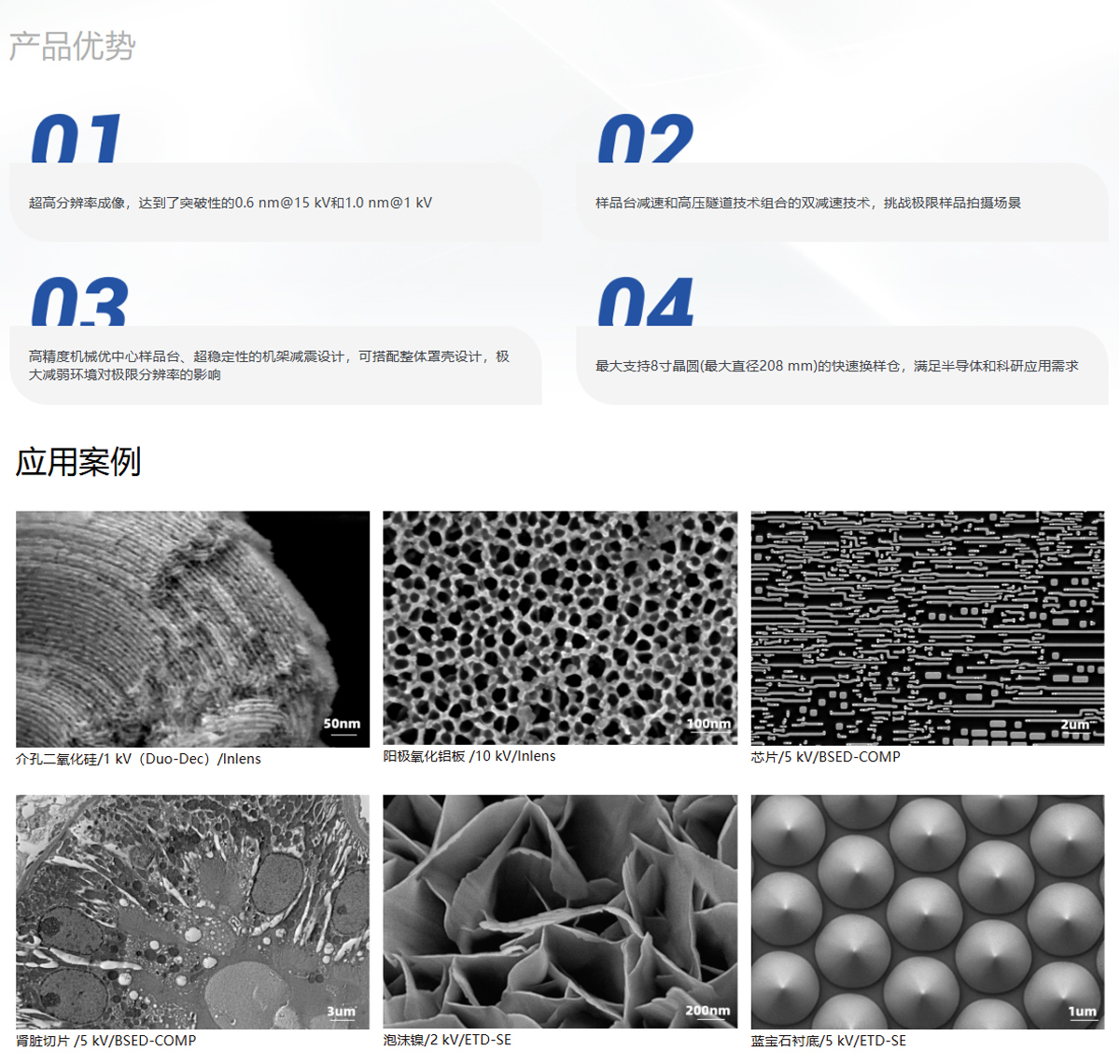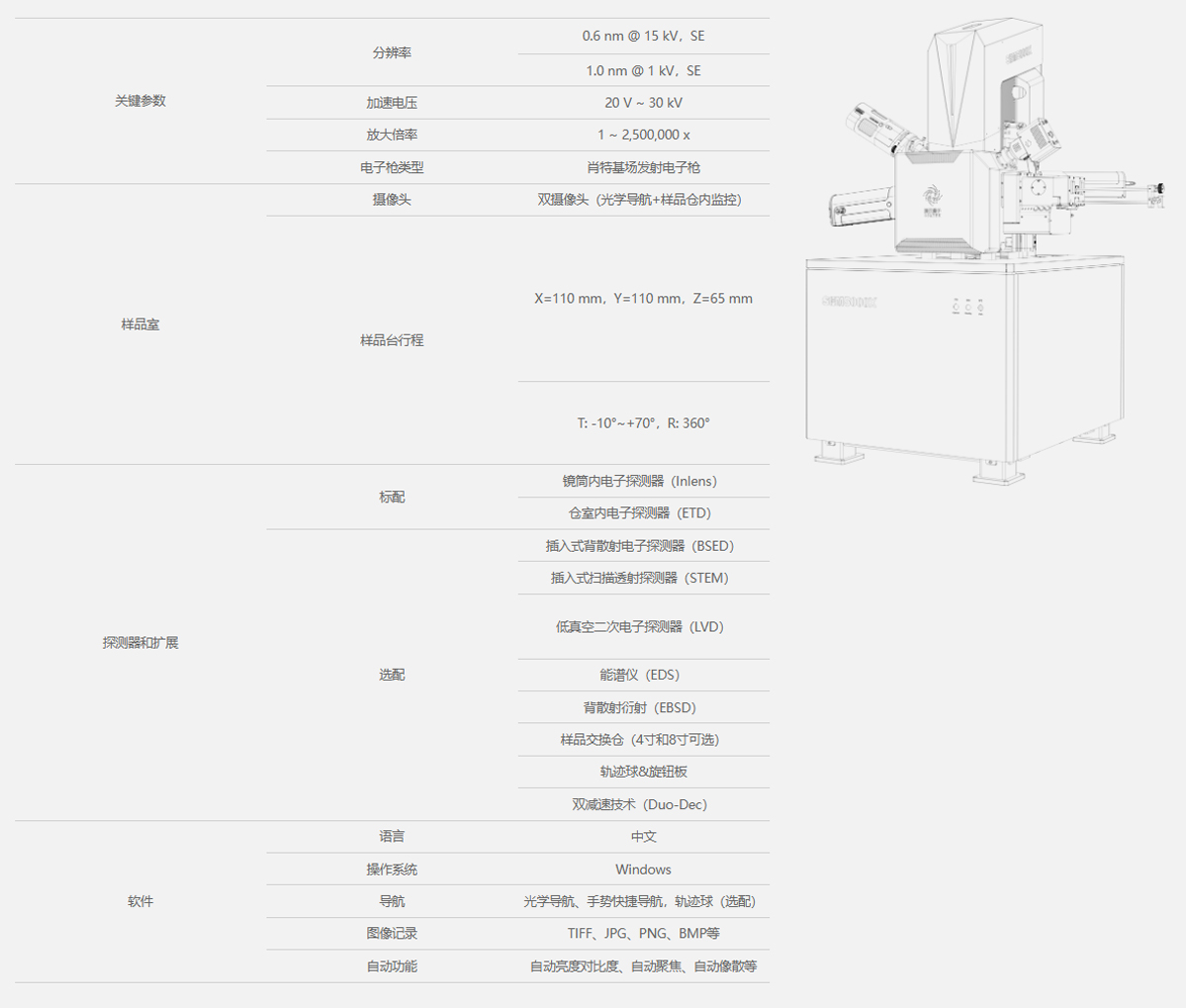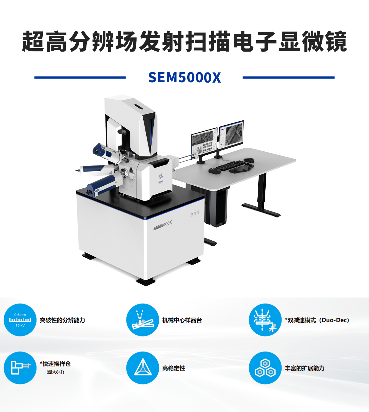 产品概述:SEM5000X是一款超高分辨率场发射扫描电镜,电子光学镜筒设计优化,综合像差降低了 30%,从而达到了0.6 nm@15 kv和 1.0 nm@1 kv的超高分辨率。超高分辨率和高稳定性,可在先进纳米结构和纳米材料的研究、高端芯片半导体的研发制造等领域发挥其性能优势。